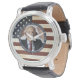 Honre o seu amado com um relógio patriótico personalizado de fotografia. Este relógio militar único é o presente perfeito para si, para a família ou para os amigos, para prestar homenagem a um veterano militar, soldado militar, exército, fuzileiros navais ou soldado caído. Este memorial patriótico apresenta um vintage vermelho, branco e azul, bandeira americana americana, estrelas e faixas. Cite "In Loving Memory" (Em Memória Adorável). Personalize com fotos favoritas, nome. Perfeito para Favores Funerais Militares, Celebração do Salvamento da Vida. COPYRIGHT © 2020 Judy Burrows, Black Dog Art - Todos Os Direitos Reservados. Vintage Patriotic Memorial American Flag Watch