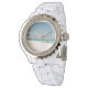 Este relógio de esmalte branco das senhoras foi desenhado com a minha fotografia de Seven Mile Beach, Grand Cayman e rochas à volta do rosto.