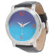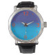 Um relógio de pulso muito simples, com face grande e azul variado, numerais vermelhos. Clássico no estilo, este relógio nunca passará de moda. Movimento de quartzo de três mãos e pulseira de couro genuíno.
