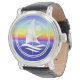 Relógios de designer com design branco de veleiro em um fundo colorido de arco-íris. Escolha entre muitos estilos de observação e cores.