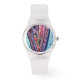 Um pequeno coração dourado é rodeado por um coração cor-de-rosa dentro um coração roxo lavanda sobre um fundo azul macio. Roxo e marinho esboçam os corações. O brilho corresponde à cor em designs de padrão no topo da pintura a aquarela. Este é um detalhe de pintura do trabalho de arte de "Fé" da Palavra Inspiracional. Faça com que o coração de amor personalizado assista designs com suas mensagens pessoais e/ou fotos. Use o botão "personalizar". As joias artísticas fazem presentes personalizados de pulso personalizados e excelentes!
