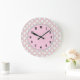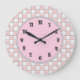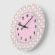 Retrorna os relógios de parede com estilos de cerâmica, cor-de-rosa e branco, impressos em estilo 1950, sobre o fundo do azulejo de relógio nesta decoração de decoração de parede para a sua cozinha, sala de jantar ou qualquer sala na sua casa que você queira adicionar alguma cor e personagem. As cores incluem rosa, preto e branco.