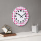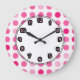 bolinhas de parede de cor rosa moderno, com pontos na face do relógio, neste design de relógio decorativo para meninas, crianças ou dormitórios universitários. Adicione a qualquer sala da sua casa que você queira adicionar alguma cor e caractere. As cores incluem rosa e branco.