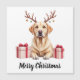 "Esta bela ilustração apresenta um retrato detalhado de um amoroso Labrador Retriever amarelo com sua característica cabeça larga, expressão gentil e pelagem dourada lisa. O cão recebe um toque encantador de feriado com chifres de rena adornados com pequenos ornamentos dourados e verde/azul. Dois presentes de Natal lindamente embrulhados com fitas vermelhas estão exibidos de forma proeminente de cada lado. Este gráfico de alta qualidade é ideal para presentes personalizados de Natal para donos de Lab, cartões de Natal, roupas, ornamentos ou qualquer produto que celebre esta raça de cão amigável e dedicada."
