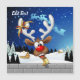 Um divertido cervo de desenho animado com um nariz vermelho brilhante e grandes chifres brancos, adornado com um laço vermelho e dourado, espreita por uma janela aberta. Do lado de fora, uma paisagem nevada com silhuetas de pinheiros e uma pequena casa iluminada é visível sob um céu noturno azul escuro cheio de estrelas. O trenó do Papai Noel puxado por renas está voando ao longe. A cena evoca uma atmosfera festiva e caprichosa de Natal. Arte Vetorial Original Copyright BluedarkArt TheChameleonArt.