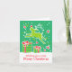 Rena com o nariz vermelho à moda bonito que salta sobre presentes no cartão sazonal do Natal do verde da neve. Cartão projetado e ilustrado por Sarah Trett.