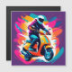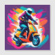 Uma ilustração artística vibrante exibindo um indivíduo pilotando uma scooter laranja, cercado por respingos dinâmicos de cores vivas e movimento. Captura temas de energia, criatividade e estilo de vida moderno.