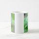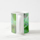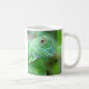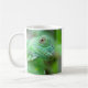 Caneca de café bonita com uma foto de um lagarto verde da iguana em uma folha molhada após uma chuva.