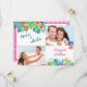 Esta foto moderna e colorida salva a data do anúncio do casamento, com o elegante e tendencioso roteiro escrito à mão e as cores do rosa-baga, rosa-pavão, fúcsia, chá, azul-turquesa, verde, laranja, amarelo e vermelho, é perfeita para o casal que vai ter um casamento de destino: numa praia havaiana, um casamento na praia da Flórida, ou um casamento na praia de Caribe. Imagens em aquarela de hibisco, folhas exóticas, pássaros do paraíso, flores tropicais, abacaxis e palmeiras agridem a carta na frente e atrás. A cor cor rosa do padrão do gesso do lado traseiro pode ser personalizada de acordo com sua preferência. Fácil de personalizar com sua própria foto e texto.
