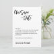 Apresentando o Cartão de Anúncio "Desguardar a Data" da Elegance Collection - uma forma saborosa e refinada de comunicar a infeliz necessidade de adiar seu casamento. Este cartão, caracterizado por linhas limpas e estética moderna, serve como um meio sofisticado para transmitir atualizações importantes aos seus queridos convidados. O cabeçalho em negrito "Unsave the Date" (Dessalvar a data) assume o palco central, captando imediatamente a atenção e definindo o tom da mensagem a seguir. Abaixo, uma mensagem personalizável, como: "Com arrependimento, somos escrevendo de informá-lo que tivemos que adiar nosso grande dia devido a circunstâncias imprevistas. Pedimos desculpas por qualquer inconveniente e agradecemos a sua compreensão." Sob a mensagem, os nomes do casal são apresentados elegantemente, acrescentando um toque pessoal ao anúncio. A parte traseira do cartão fornece espaço para uma mensagem ou detalhes extras, permitindo que você transmita informações adicionais, expresse gratidão ou compartilhe quaisquer outras atualizações pertinentes com seus convidados. Feito com precisão e sofisticação, a Placa de Anúncio "Desguardar a Data" da Elegance Collection garante que, mesmo em tempos difíceis, suas atualizações sejam transmitidas com graça e consideração pelos seus convidados.