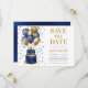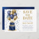 Esta fabulosa festa de aniversário masculina Salve o cartão Data com um bolo azul de marinho de 2 camadas e balões de ouro com marinho azul e ouro, o número 80 em ouro e confete azul brilhante seria perfeito para pedir às pessoas que reservassem esta data especial para a próxima Festa de aniversário. É tradicional e clássico enquanto é fresco, moderno e contemporâneo. A parte de trás é uma folha azul-marinho coordenadora.