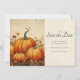Guarde o cartão de ponto com uma ilustração rústica com abóboras laranja e folhas de queda. Uma vibração do outono.