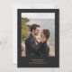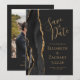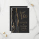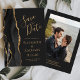A borda esquerda deste elegante cartão de salvar a data do casamento moderno apresenta uma borda de ágata em aquarela preta aparada com brilho dourado falso. O texto personalizável combina escrita à mão em dourado, fontes copperplate e itálico em um fundo preto claro. No verso, substitua facilmente a imagem de amostra por uma foto dos futuros noivos e adicione algumas linhas de informações adicionais, como o URL do site do seu casamento.