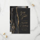 The left-hand edge of this elegant modern wedding save the date card features a black watercolor agate border trimmed with gold faux glitter. The customizable text combines gold-colored handwriting, copperplate and italic fonts on an off-black background. The reverse side features a matching black and gold agate design.