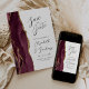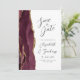 A borda esquerda deste elegante casamento moderno salve o cartão de data apresenta uma borda vermelha e borrifada de cor-d-água cortada com brilho dourado. O texto personalizável combina a escrita manual de cinzas de carvão, as fontes em copperplate e itálico em um fundo branco. O lado inverso apresenta uma burgundy e uma design de agata dourada.