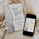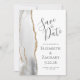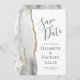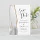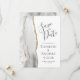 A borda esquerda deste elegante casamento moderno salve o cartão de data com uma cinza e uma aquarela branca, aparada com falsa brilho dourado. O texto personalizável combina a escrita manual de cinzas de carvão, as fontes em copperplate e itálico em um fundo branco. Um design de agate de coordenação aparece no verso.