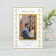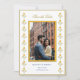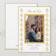 Cartão de salvar a data amarelo e branco com borda de maravilha em aquarela com foto do casal.
