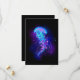 Água-viva grande, azul, desenhada artisticamente, brilhante, brilhante, com longos tentáculos sobre fundo preto com bioluminescência roxa. Água-viva luminosa.