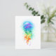 Água-viva grande, iridescente, desenhada artisticamente, brilhante, com longos tentáculos em branco, pintada sobre fundo de aquarela multicolorido. Água-viva arco-íris.