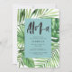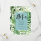 Convites de festas de folhagem modernas de palmeiras tropicais. Texto do script de efeito pintado à mão. Parte de uma coleção de tendência de verão. Cor do lacre.