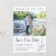 Vestido no seu templo pesca Casamento salve a data com um gancho de pesca segurando anéis de casamento em azul de aço e cinza. Personalize o convite com sua foto de noivado e detalhes do casamento no bloco de texto justificado à esquerda. A parte de trás é acabada com um padrão de rede de peixe azul de aço.