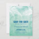 DA COLEÇÃO DO CASAMENTO: SOB AS PALMAS — CASAMENTO SALVAR O ANÚNCIO DE DATA num fundo de coloração d'água do oceano claro com uma silhueta branca de ramos de árvores de palma no topo. As fontes coloridas azuis são selecionadas, mas você pode personalizar e alterar para qual fonte de cor você mais gosta. Simples, mas elegante, com um reflexo artístico. Perfeito para qualquer casamento. Para obter informações sobre alterações de design personalizadas pelo designer independente, envie um email para paula@labellarue.com ANTES de personalizar ou fazer um pedido.