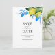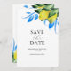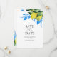 Anuncie seu noivado com este moderno cartão de "save the date". Ele apresenta uma mistura de tipografia clássica e cursiva com uma borda de meus originais limões amarelos em aquarela com enfeites azuis em um fundo branco crocante. Use os campos do modelo para personalizar com seu nome e data de casamento. Escolha entre uma variedade de cartões de alta qualidade. Meu favorito para este é feltro porque parece papel de aquarela. Um design rústico e elegante para temas de casamento mediterrâneo e anúncios de noivado. Para ver o conjunto de papelaria de casamento correspondente, visite www.zazzle.com/dotellabelle