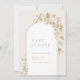 Estes elegantes cartões salve a data modernos apresentam ilustrações florais botânicas de ouro falso, enquadram uma delicada linha de ouro em forma de arco. Sua informação aparece em um roteiro romântico e fonte sofisticada de serif. Convites de casamento floral de excelente para casamento romântico de jardim e casamento luxo moderno. Veja todas as peças correspondentes na coleção.