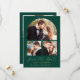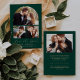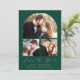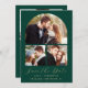Este simples e minimalista Cartão Salvar a Data apresenta um arco de colagem de 3 fotos acima das palavras "Salvar a Data" em um elegante guião de manuscrito dourado, seguido pelos nomes do casal, data do casamento e cidade em sans serif em um fundo verde esmeralda. Adicione uma quarta foto horizontal e uma mensagem mais detalhada com informações adicionais no verso.