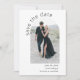 Bela simplicidade e estilo artístico fazem com que este casamento artístico moderno salve a pop do cartão de data com apelo. Ele apresenta um modelo de foto em forma de arco na parte frontal da placa para carregar a foto desejada. Há uma modelo de texto na frente da carta para personalizar com os nomes da noiva e do noivo e a data de casamento planejada. A parte traseira deste cartão tem um exemplo de mensagem com detalhes adicionais para personalizar, juntamente com um modelo de código QR para fazer, é fácil para os convidados verem o seu site de casamento. Mostrada aqui com um fundo branco comum, esta placa está disponível em outras cores também.