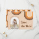 Surpreenda seus convidados com este lindo e retrô cartão de Save the Date, apresentando arcos-íris boho, uma foto arqueada e tipografia dos anos 70. Adicione facilmente seus detalhes clicando na opção "personalizar este modelo".