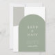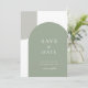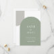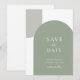 Defina o tom do seu casamento com este cartão minimalista de "save the date" com dois arcos. Um arco básico em verde-sage e um arco simples cinza no canto. O layout limpo e retrô oferece uma abordagem moderna do estilo boêmio elegante, tornando-o ideal para casais que planejam uma celebração ao ar livre, casamento no pátio ou reunião íntima.
