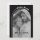 Esta placa Save the Date (Salvar data) tem um design moderno e minimalista, usando cores preto e branco. Mostra um arco moderno armado com uma foto esmaecida do casal, acrescentando um toque elegante. Os nomes dos casal são escritos em uma fonte curvada por na moda no topo, seguindo a curva de uma linha que se estende à direita. A cor ao redor do arco é preta. A parte de trás do cartão apresenta outra foto e o site de casamento do casal.
