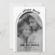 Arca branca preta moderna e casamento minimalista de sobreposição de fotos Guarde o Cartão de Data. Esta placa Save the Date (Salvar data) tem um design moderno e minimalista com um esquema de cores preto e branco. O ponto focal da placa é um arco que envolve uma foto esmaecida do casal, adicionando um toque de elegância. Na parte superior da placa, os nomes do casal são gravados em uma fonte curva em na moda, seguindo a curva de uma linha que se estende à direita. Ao entregar o cartão, encontrará outra foto e o site do casamento do casal.