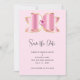 Salve a placa de data com um arco brilhante brilhante brilhante com contorno de ouro e uma pedra-pomes rosa facetada no centro. Glama de luxo feminina.