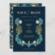 Este lindo Save the Date certamente causará uma ótima impressão! O design apresenta um motivo floral inspirado em William Morris vintage moderno em azul e amarelo, as palavras "Save The Date" em tipografias elegantes com um espaço para foto em arco no verso.