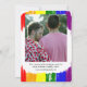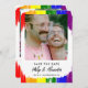 LGBTQ de dois lados salve a placa de data com pincéis arco-íris moldando uma foto do casal com texto preto. Do outro lado, outra foto e seu site de casamento para que seus convidados possam encontrar mais informações online sobre seu próximo casamento.