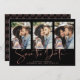 Arte Deco Rosa Dourada Manuscrito Salve a data Cartão com fotos múltiplo em uma fonte elegante e evoca uma sensação romântica manuscrita. Na parte de trás está um design de estilo geométrico, estilo deco de arte, em folha de rosa de ouro em giz, sobre fundo preto. Projetado para usar três de suas fotos favoritas para personalização adicional. Adicione facilmente seus nomes e datas para um design verdadeiramente personalizado.