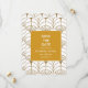 Descubra o eterno da era Gatsby com nosso casamento Geométrico com o Gatsby Branco Dourado, Salve a Data. Apresentando intrincados padrões geométricos em espiral de ouro num cenário branco pristino, este design dá o tom para uma celebração luxuosa e extravagante do amor. Feito com cuidado meticuloso, esta salva de data captura o charme da safra e a sofisticação dos 20 itinerantes, transportando seus convidados de volta no tempo para uma era passada de elegância e opulência. Assuma o fascínio da era Gatsby enquanto anuncia a sua próxima união em estilo. Deixe a Arte Geométrica Deco Dourado Gatsby White Casando Salve a Data ser o primeiro vislumbre da magia vintage que espera, deixando seus convidados animados e ansiosamente antecipando sua inesquecível celebração do amor e grandiosidade.