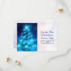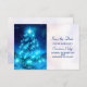 Um cartão de dia com uma árvore de Natal azul-elétrica moderna. Decorado com luzes ao redor. O fundo tem luzes desbotadas.