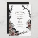 Belos florais góticos com rosas, penas rasas e galhos espinhosos enquadram esta parte até que a morte nos salve o cartão de data. É muito bonito e melancólico. Perfeito para o seu casamento gótico ou de Halloween. Veja a coordenação de itens no nosso compro, Encantado Finch.