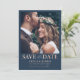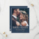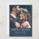 Ponha os planos de casamento em andamento com este moderno cartão de data, projetado para fazer uma primeira impressão impressionante. A frente apresenta sua foto favorita ao lado de uma impressionante tipografia rosa metálica "Save the Date" (Salvar a data) em um sofisticado fundo azul escuro, criando um contraste na moda. Ao contrário, você encontrará espaço para um monograma personalizado, maravilhosamente enquadrado pela delicada folhagem de rosa de ouro falso para um toque adicional de elegância. Perfeito para casais que querem misturar estilo contemporâneo com charme de eterno, este cartão anuncia seu grande dia de uma forma refinada e memorável.