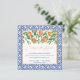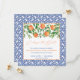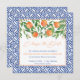 Laranjas aquarelas, flores bonito e folhas brilhantes verdes escuras são complementadas por bordas azuis e brancas de azulejo cobalto e padrão inverso nesses cartões Change The Date.