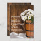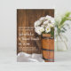 Anuncie sua próxima cerimônia de casamento com o charmoso Balde de Madeira e Casamento de Marcos Brancos Salve os Anúncios de Data. Este casamento informal, mas elegante, feito em rancho, mantém o anúncio da data com uma fotografia floral quase melhorada digitalmente de um balde de madeira repleto de flores margaridas brancas e um fundo de madeira marrom rústica e curvada.
