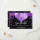 Uma garota e uma moda Salvem a data para uma Quinceañera, 15 festa de aniversário. Um fundo preto decorado com gotas de brilho púrpura, faíscas e balões. Personalize e adicione uma data e nome/idade. O texto: Salvar a Data é gravado com um script de estilo com letra de tendência grande.