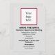 Você é um empreendedor anunciando sua reunião de oportunidade de negócios? Coloque seus convidados e seus parceiros de negócios com esses cartões salve a data personalizados. INSTRUÇÕES: Na frente, forneça o logotipo da empresa. (Certifique-se de que está visível sobre fundo branco com quadro de cereja - MAIS OPÇÕES DE COR ESTÃO DISPONÍVEIS. Orientação definida como Ajustado.) Em seguida, forneça o ID de sala ou link da videoconferência (Zoom, Discord Go Live, etc.). Fornecer horário no formato de 24 horas ou 12 horas (use AM ou PM se estiver usando esta última); data (XX/XX/20XX); e admissão, se aplicável. No verso, forneça até 3 contatos (identificadores de mídias sociais, números de telefone, etc.) para convidados a RSVP. Envie cartões salve a data fotográficos nos envelopes brancos inclusos para evitar incidentes negativos durante sua reunião. ISENÇÃO DE RESPONSABILIDADE: Verdadeiros Acreditadores da Liberdade NÃO endossam nenhuma empresa de marketing de rede específica.