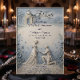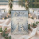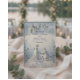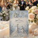 Announce your formal engagement with a romantic, neoclassical aesthetic featuring a dusty blue and cream palette and elegant formal calligraphy.This design relies on a structured hierarchy of classic serif and formal calligraphy, maintaining a clean visual layout with balanced spacing. The artwork illustrates a highly detailed digital bas-relief effect of a kneeling man proposing to a woman in a flowing gown against a domed classical chapel. Rendered in a sophisticated palette of powder blue, slate gray, and off-white, the composition includes a cobblestone path, scattered petals, and a botanical floral border mimicking carved shadows and highlights.This is a flat printed image with a faux carved stone texture effect, not actual raised material.