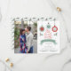 Férias de Natal, casamento ou outra foto de ocasião, "Salve a data", design. Apresenta três design de flocos de neve, bolhas redondas em verde-menta, cinza clara e vermelho-vermelho-dusky no topo com círculos centrais para o mês, dia e ano com duas bolas ocas abaixo, bem como o texto "Salvar a data" (ineditável — designer de contato se precisar de mudança), seguido de um faixa verde-menta com as palavras editáveis "para o casamento" e seus nomes, bem como o local. Duas ramificações de pínus desenhadas à mão ao redor do design no fundo. Nas costas há um padrão repetido de saltos e pinheiros. Basta adicionar sua foto e detalhes para completar.