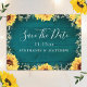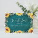 Estes cartões salve a data apresentam um design de aquarela com girassóis e borda de flores do hálito do bebê sobre um fundo de madeira lacrimogênea. Personalize estas cartas com o seu próprio texto. Estes cartões fazem parte de uma coleção que inclui outros artigos de casamento.