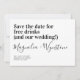 Avise aos seus amigos e familiares que você marcou um encontro com esta engraçada salve o cartão - o texto diz "Salve a data para bebidas grátis (e o nosso casamento!)"